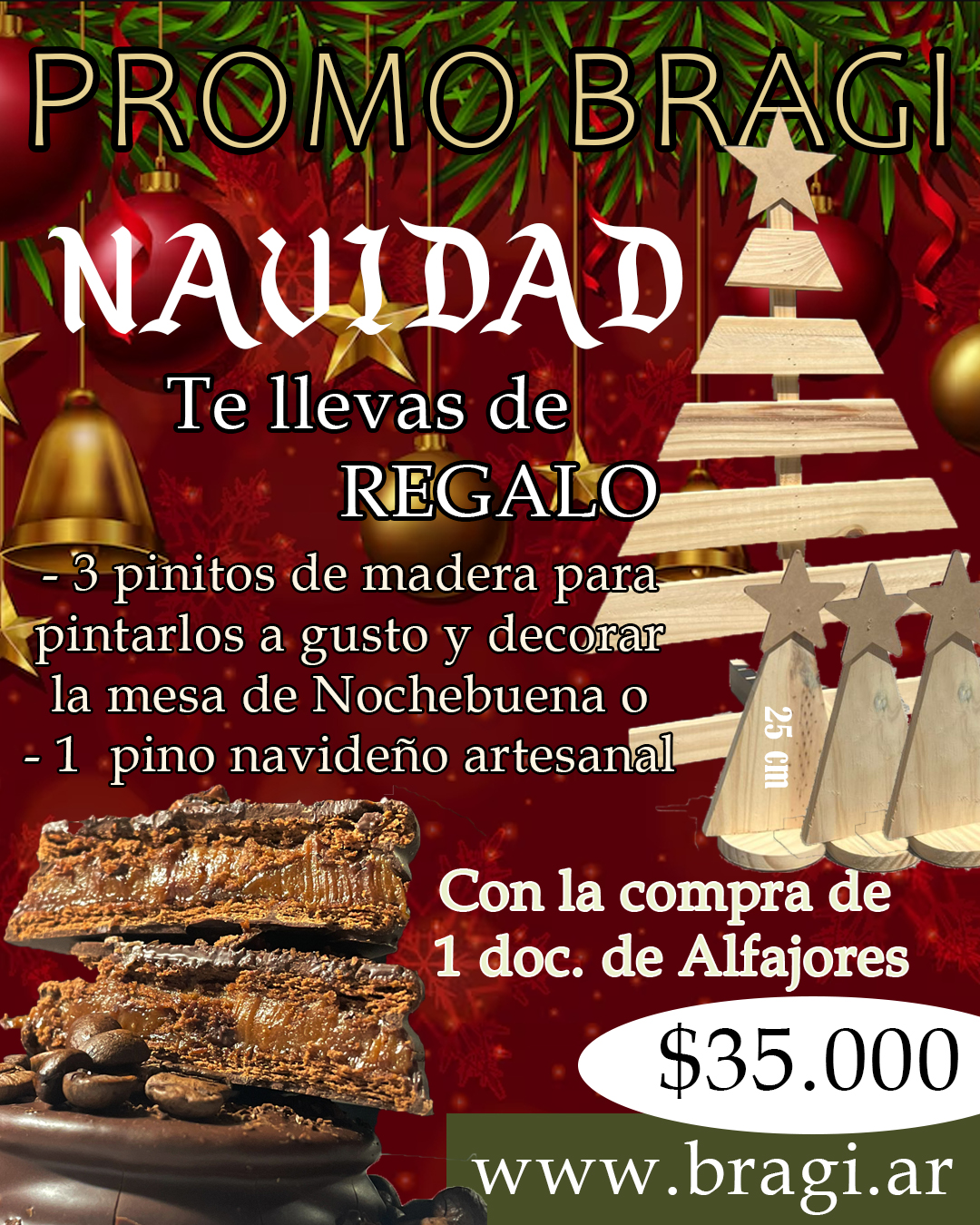 Llevate una docena de alfajores gourmet a elección y recibí de regalo un pino de madera artesanal o un set de 3 mini pinos para decorar tu mesa de fiestas.