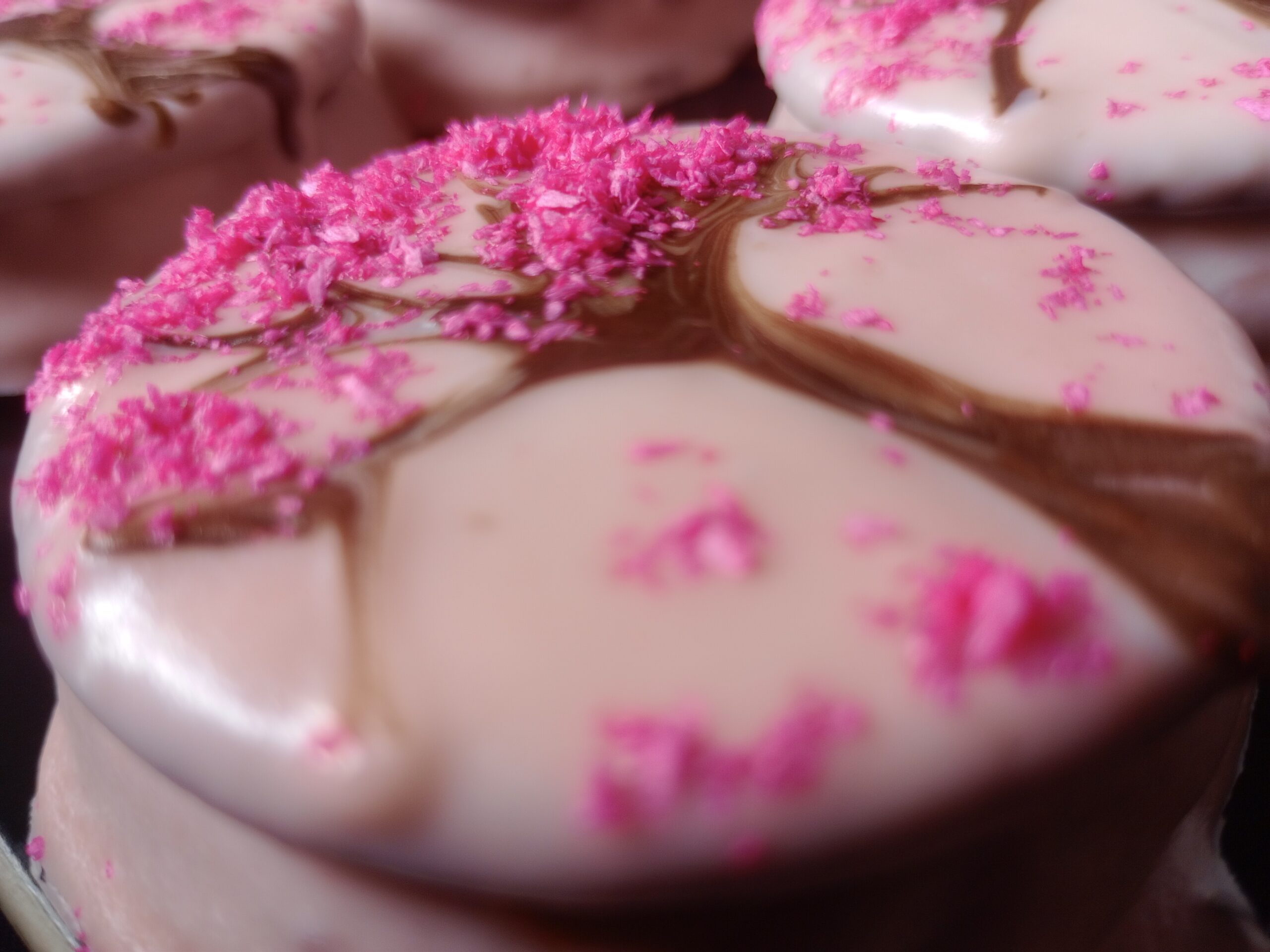 un diseño de ramas pintadas en chocolate semiamargo, que aportan un trazo elegante y un toque de amargor sutil, coronadas con una lluvia de coco rallado teñido de rosa, dispuesto como si fueran pétalos de un cerezo en flor.