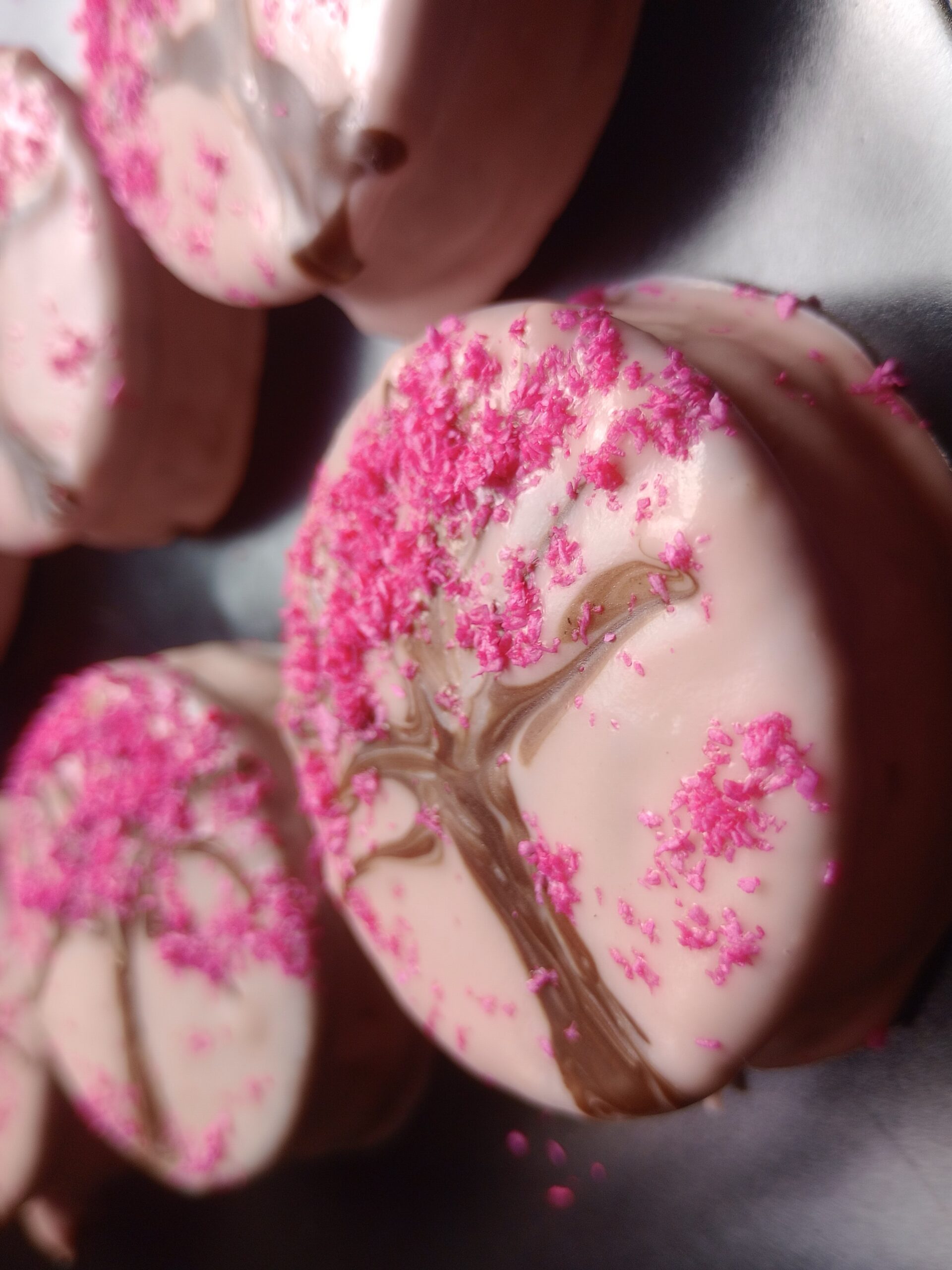 El alfajor está envuelto en una cobertura de chocolate blanco con gotas de colorante sabor frutilla, lisa, brillante y suave, que le da un aspecto delicado que acompaña sin opacar la fruta.